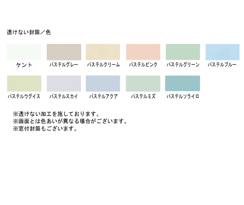 たいせつなお客様の情報、個人情報などに配慮し、中面がグレー刷りで文字が透けないように加工を施している封筒です。白をはじめパステルカラーのバリエーションもありますので多目的にお使いいただけます。